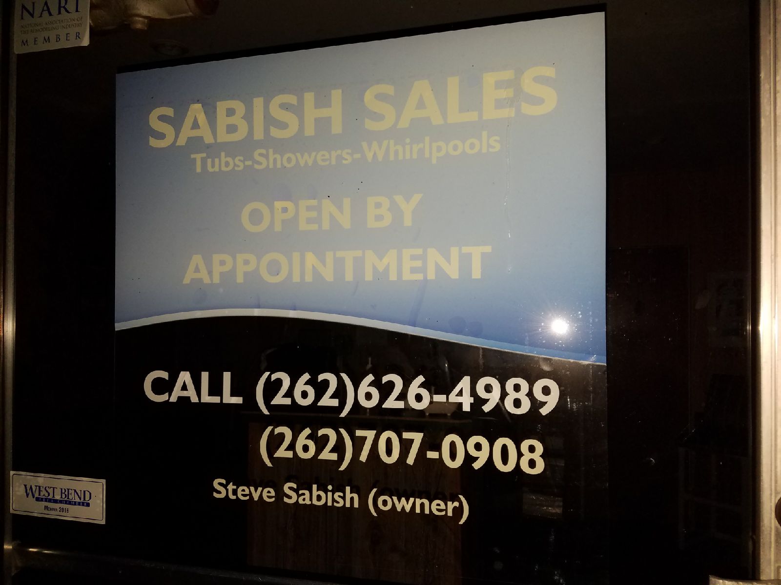 The showroom which features approximately 30 units allows customers to come and sit in the units to be sure it is the right one for them. On display at the showroom are one, two, three piece tub and showers (acrylic and gelcoat), whirlpools, air jet tubs, ADA compliant showers and walk in units. The showroom is open by appointment only. Sabish Sales is available pretty much anytime of the day. "We are here to serve our customers and their needs. Our customers are the "BUBBLES TO OUR BATH". The showroom is located at 6088 Hwy 28 West of Kewaskum between Hwys 45 and 41.